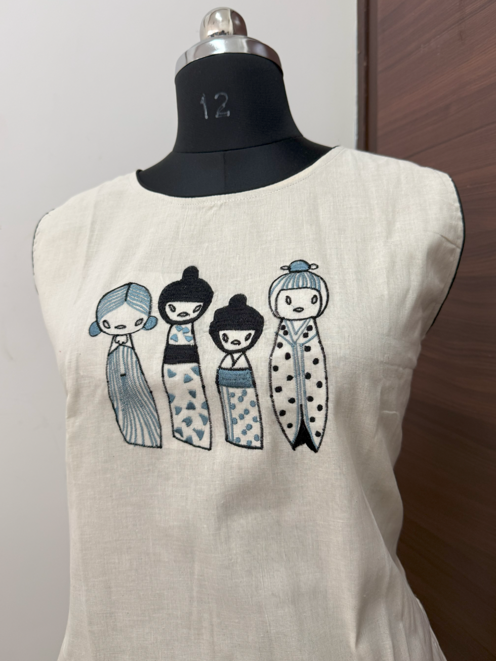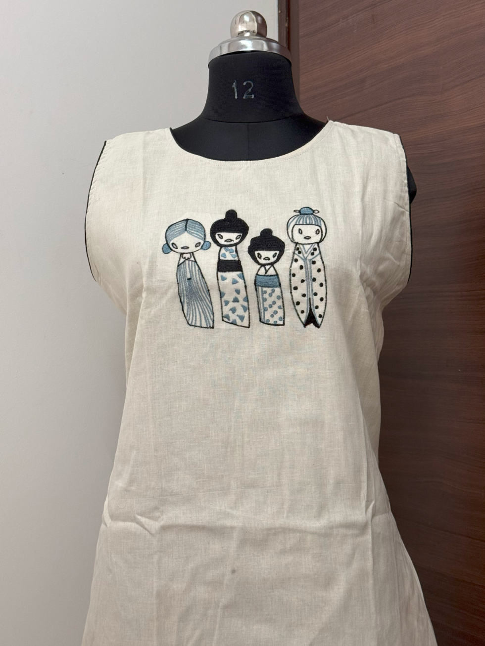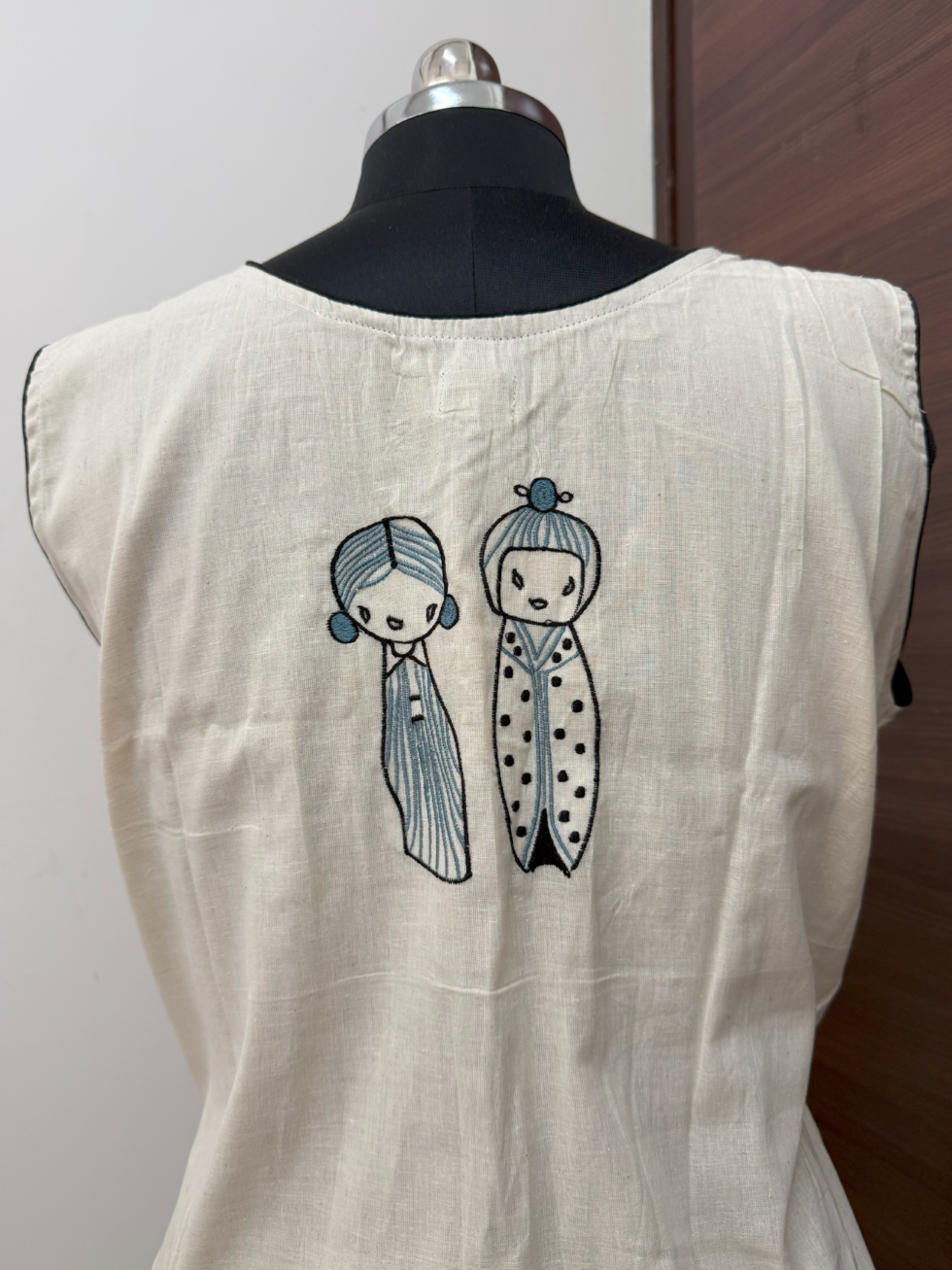 Elevate your everyday style with our Doll Tales – Machine Embroidered Cotton One-Piece. Made from 100% pure cotton, this soft and breathable dress features charming machine-embroidered doll motifs on the front, giving it a playful yet artistic appeal. The detailed embroidery in subtle indigo and black tones stands out beautifully against the natural off-white fabric, adding a unique touch to your wardrobe.
