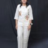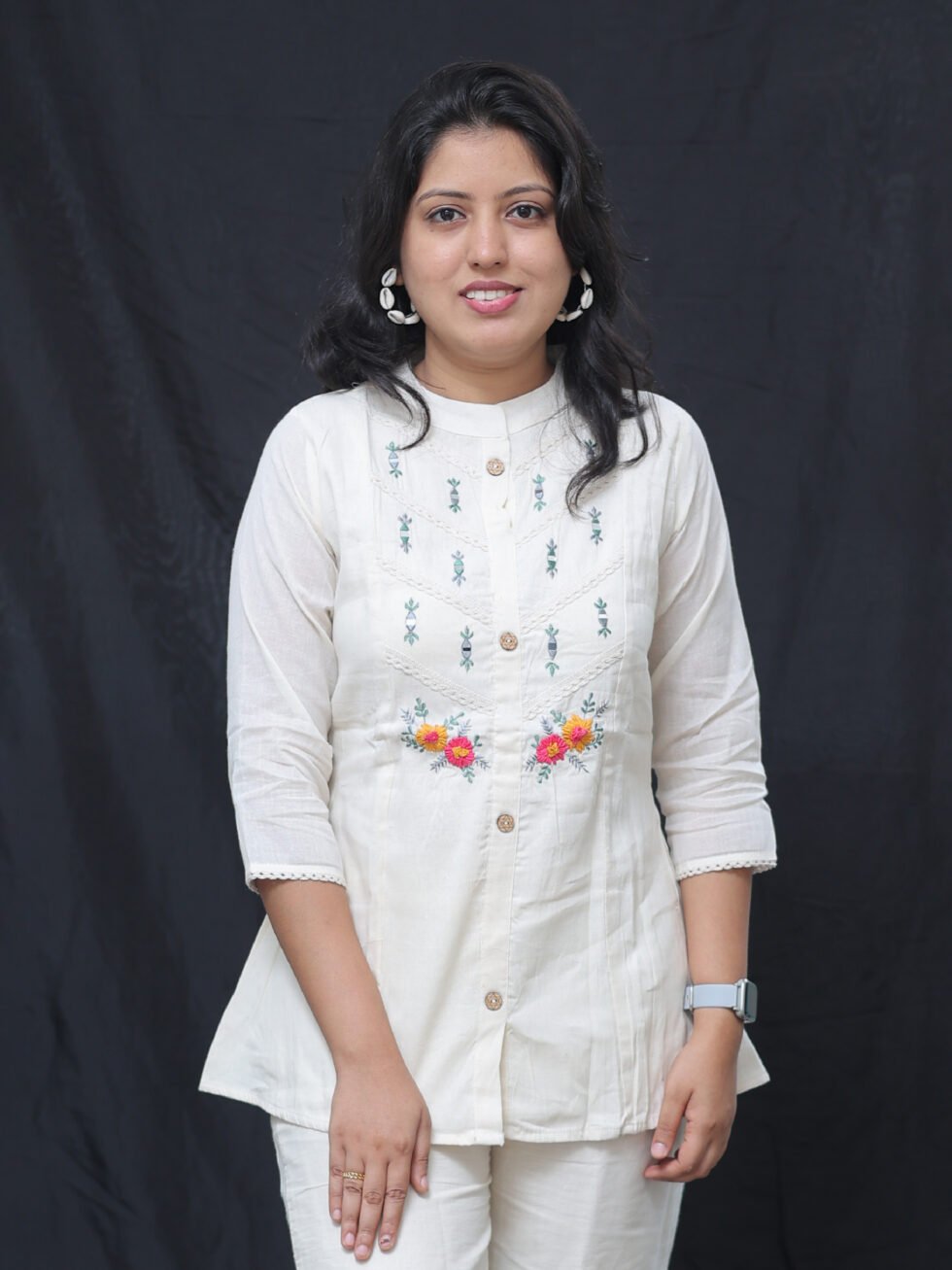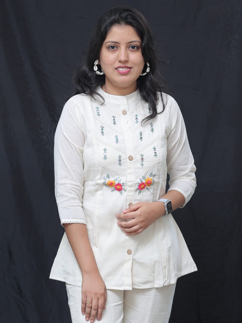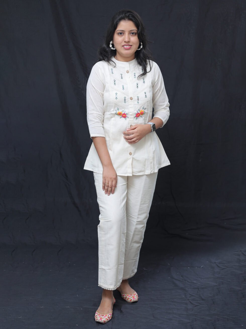 An elegant ivory cotton short top featuring vine and floral embroidery, a front button-down pattern, and a classic straight collar. Perfect for everyday and casual wear.