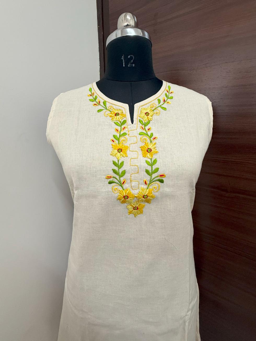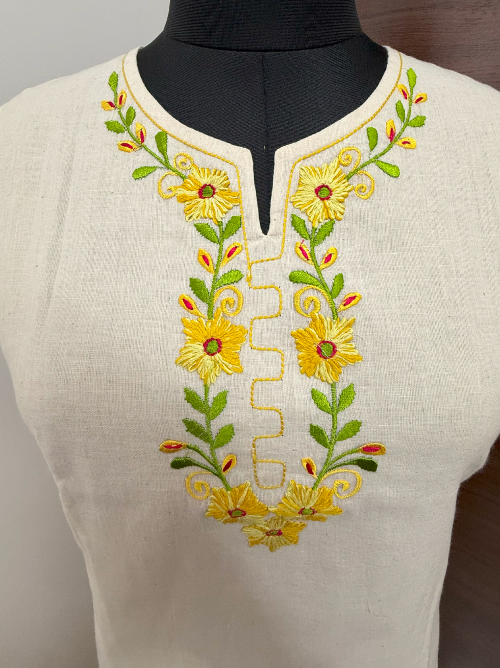 The beauty lies in its detailed machine embroidery – a delicate yellow floral vine cascading from the neckline in traditional motifs. The elegant V-slit round neck adds definition, while the sleeveless cut keeps it light and summer-ready. Its straight yet slightly flared fit makes it ideal for all-day wear.