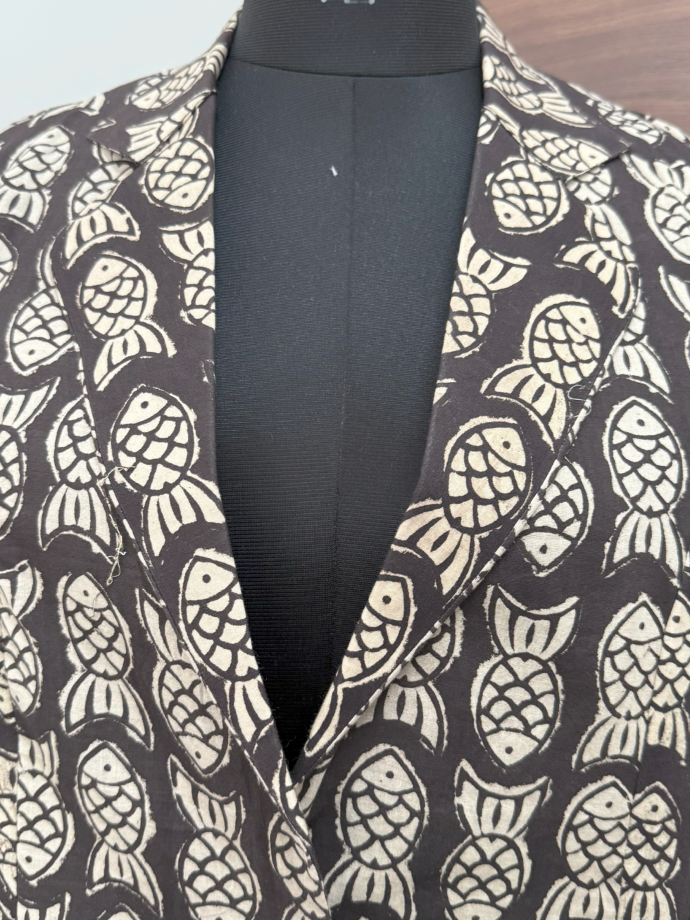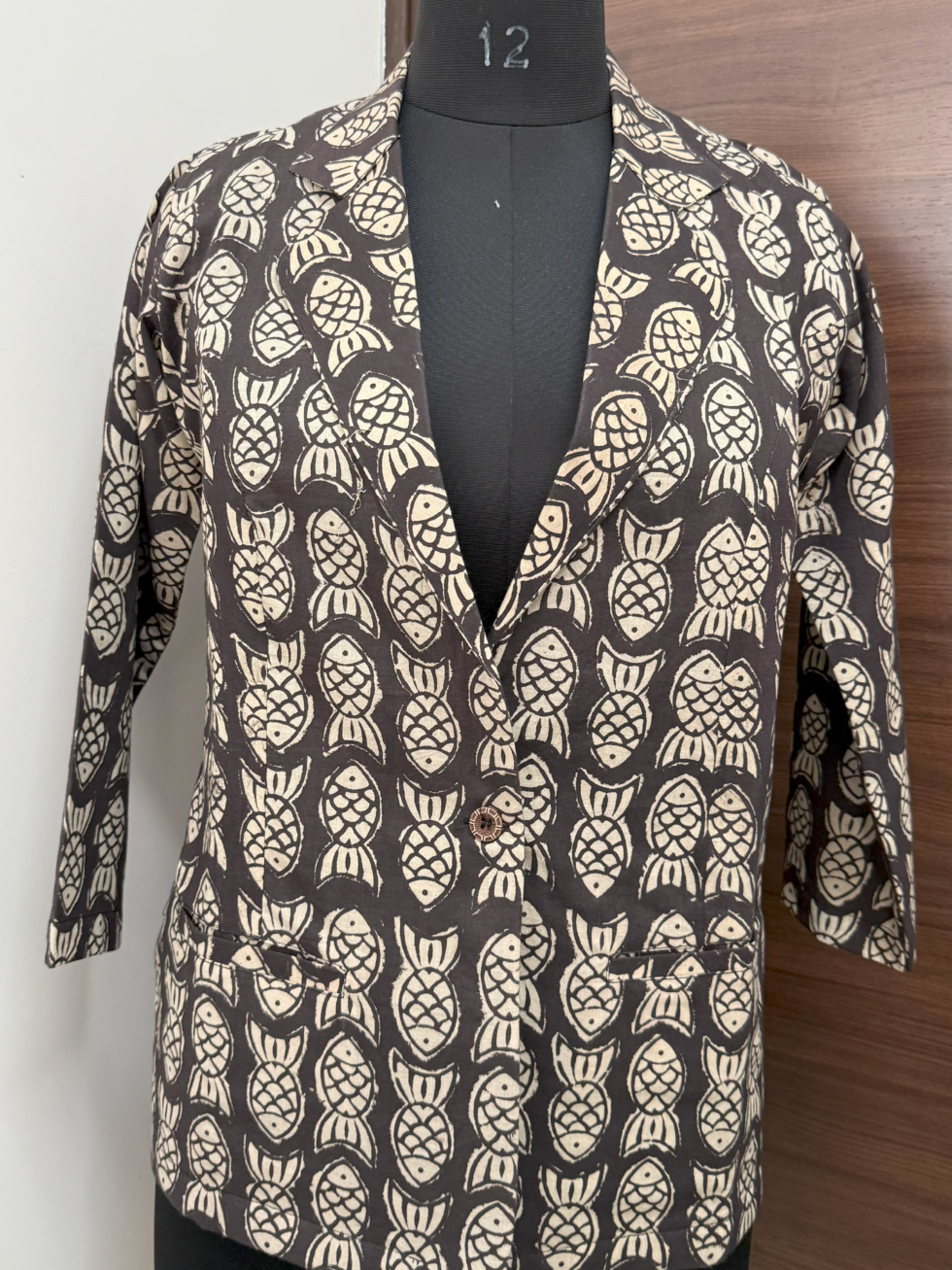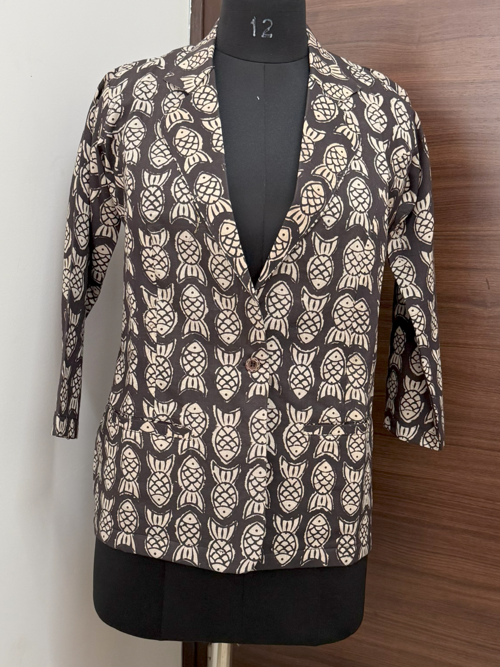 Add a quirky twist to your wardrobe with this handcrafted fish-print blazer, made from soft cotton and detailed with handblock motifs for a statement ethnic-modern blend.