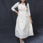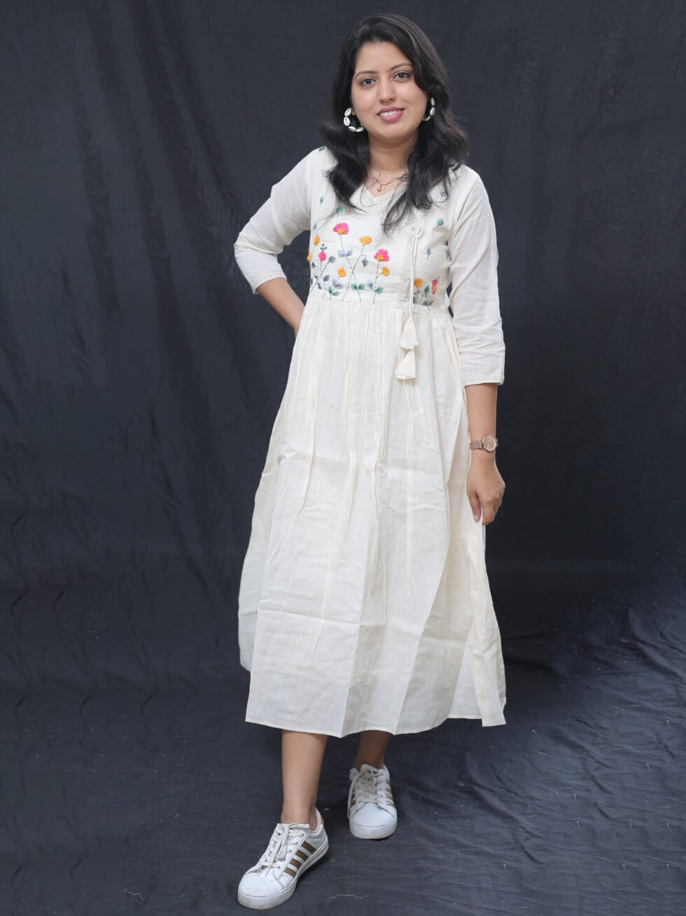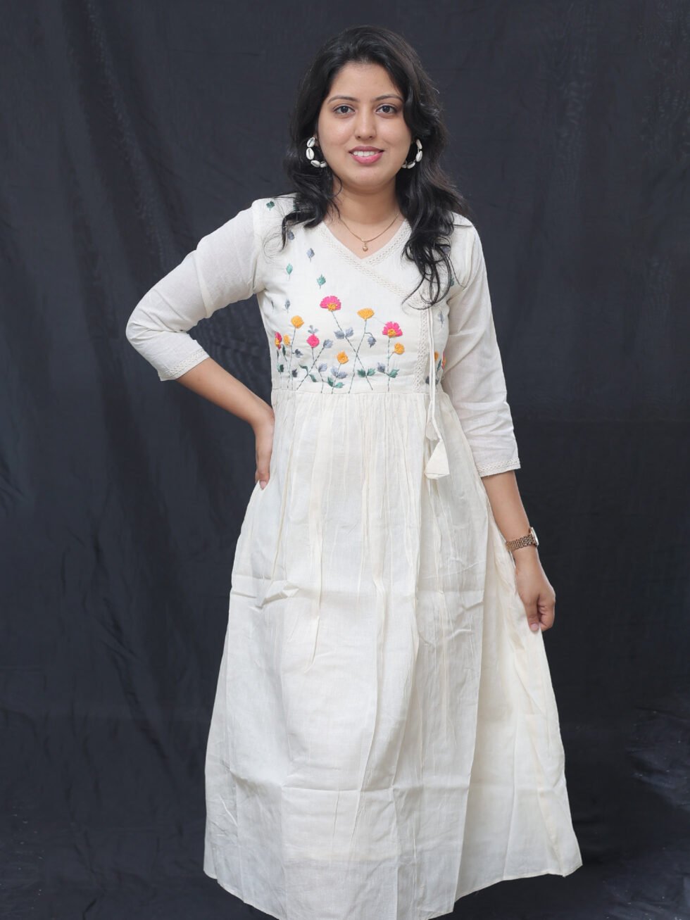 An elegant Angarakha-style one-piece in off-white khadi cotton, detailed with floral embroidery and a charming side tie-up.