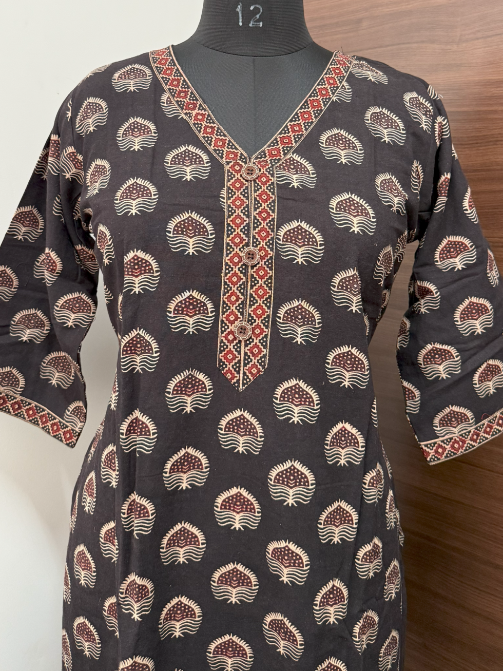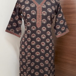Elegant and earthy, this handblock printed kurti features tree motifs and intricate neckline detailing—perfect for everyday grace with a touch of tradition.